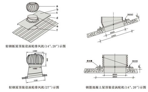 2、建筑物高度在 6米以下使用時效果較佳。 四、屋面安裝示圖說明 1、DWT-Ⅰ-Ⅱ-Ⅲ型屋頂風機屋面安裝示圖說明 ![]() 2、DWT-Ⅳ(無電機)屋頂渦輪排風機屋面安裝示圖說明 為使渦輪機達到最高的效率,安裝的位置必須在屋頂的高處,避免裝設在護墻之后或可能被附近的高樓、樹木擋住風勢的地方。 渦輪排風機安裝指南: 1、排氣機的理想位置盡量靠近屋脊線,安裝時底板上傾邊緣端嵌入屋脊金屬蓋板下的縫隙里。 2、以底板內孔為樣板面出洞口輪廓線,用切割機完成割屋面板洞口。 3 、嵌入底板,將底板用自攻釘(至少10顆)固定在屋面板上。將底板下傾邊緣端切割成與屋面板相同斷面波形折蓋空隙。 4 、裝上底座、用水平測量其底座上端部成水平再用自攻釘將底座及底板固定。 5 、排氣機套入底座端部以自攻釘固定排氣機。 6 、用玻璃膠將自釘及接合縫填補即完成安裝。 注意: 1 、每個排氣機的中心間距不小于3M。 2 、避免排氣機安裝于有亂流處,以及和垂直墻相鄰的低屋面外,炎熱區域需加裝其他排氣機以滿足特殊要求。 ![]() 注:14"內徑為Φ300,外徑Φ460;20"Φ內徑為Φ500外徑Φ620,27"內徑為Φ600/680,外徑Φ840/880。 a、渦輪排風機 b、鋼板上緣必須插入脊梁的蓋板內 c、平面鋼板成型后必須大于安裝孔的面積 d、鋼板兩側向下折成直角,必須掩蓋屋面板的波峰 e、調整座 f、安裝孔 換氣計算示例